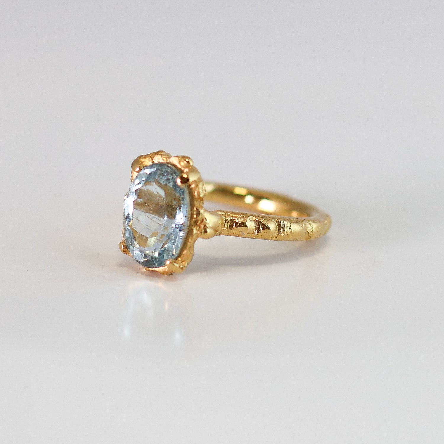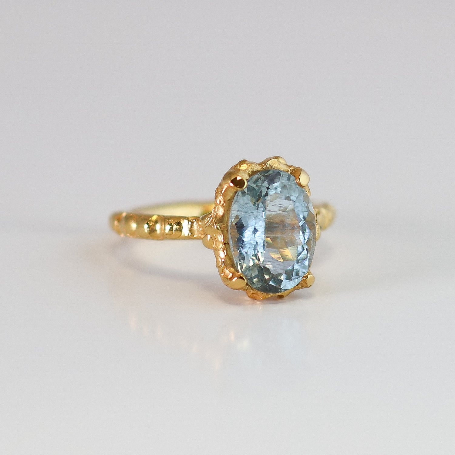 Anillo fabricado en técnica de cera de abeja y vaciado en plata .925 y baño de oro de 24k. Piedra central: aguamarina oval facetada