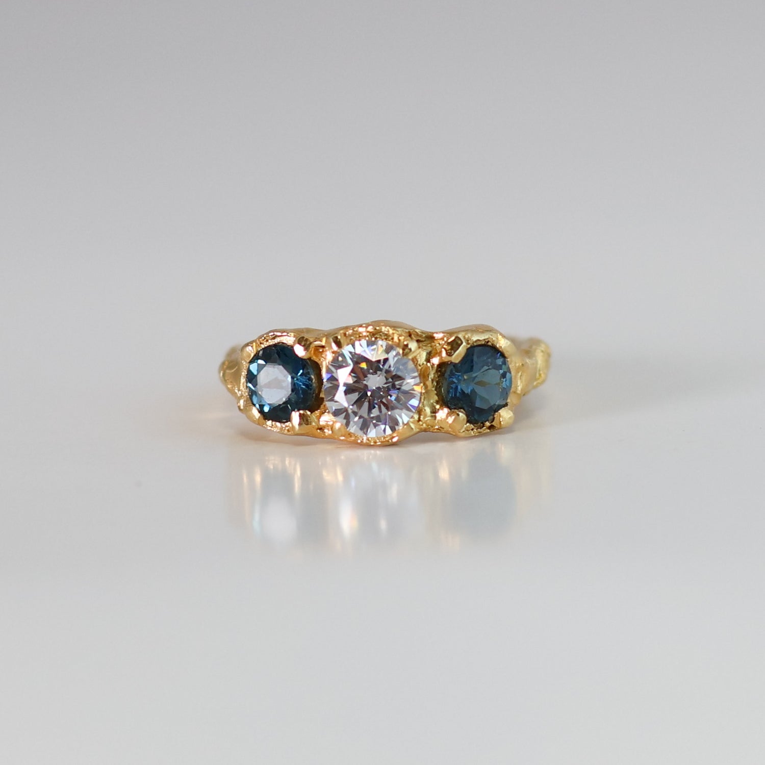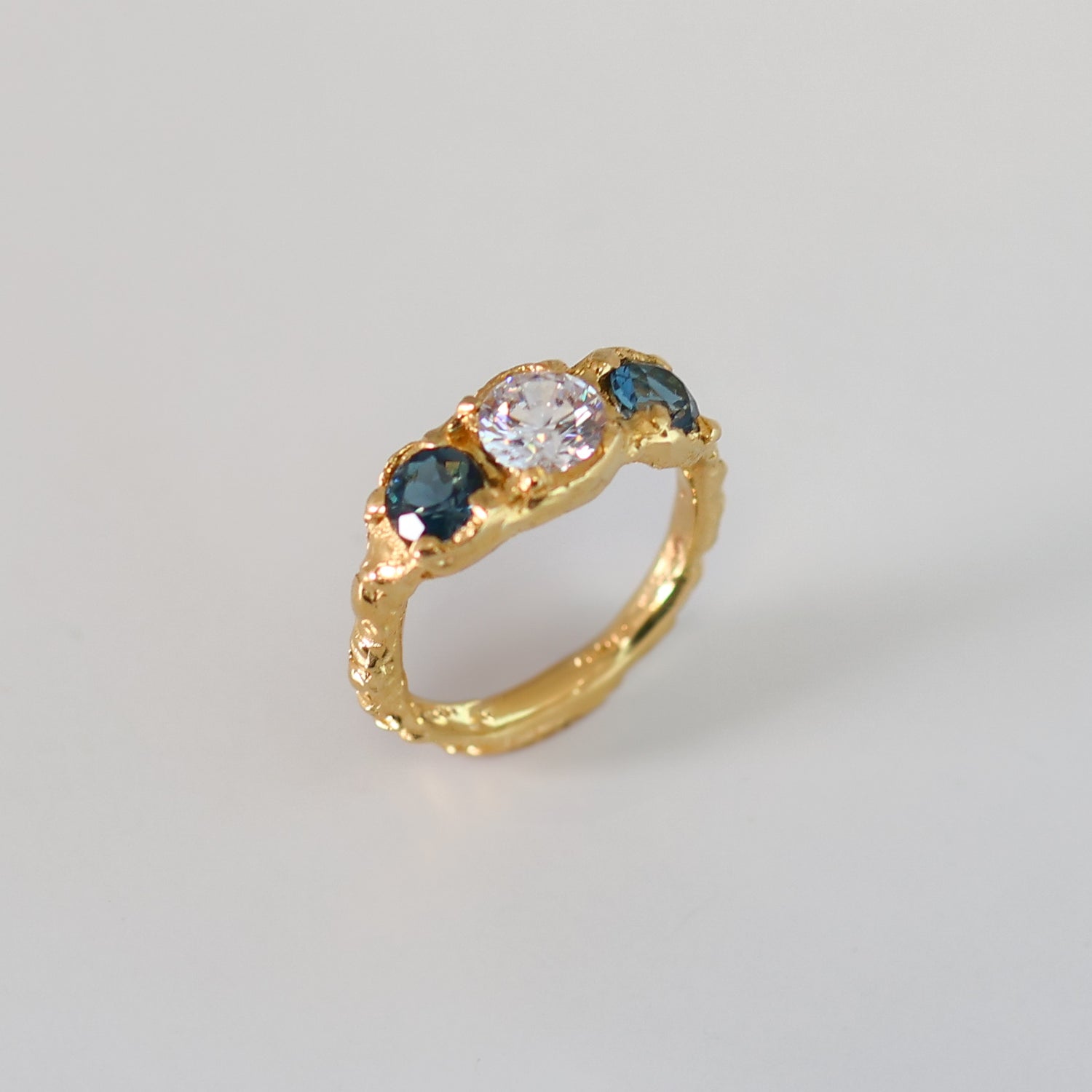 Anillo fabricado en técnica de cera de abeja y vaciado en plata .925 y baño de oro de 24k. Piedras: circonia redonda facetada, topacio london blue corte redondo.